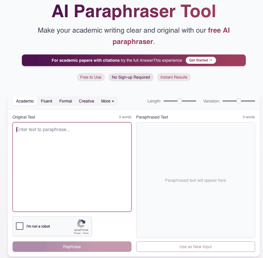 AnswerThis is an all in one research platform designed for students, academics and professionals who need accurate, high quality paraphrasing that preserves meaning, structure and citations. Unlike generic rewriters, AnswerThis is built around verified scholarly databases and integrated research tools, making it one of the most reliable AI paraphrasers available today. It supports literature reviews, essay writing, academic drafting and citation management all in one place, making your research workflow noticeably faster and more organized.